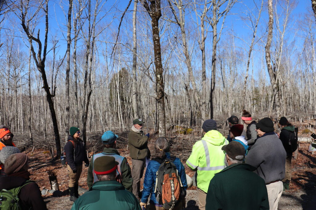 Third in the Maine Forest Climate Change Webinar & Field Tour Series, Maine’s Forest Climate Change Initiative (FCCI) hosted an interactive webinar and field tour at the Great Pond Mountain Conservation Trust’s (GPMCT) Wildlands, which focused on forest pests and pathogens. Recipient of the 2023 Maine Outstanding Tree Farmer Award, the GPMCT Wildlands is described as “a place where you may see a moose while mountain biking, an osprey while paddling along a pristine shore, or enjoy an amazing view from more than one mountain – all within minutes of Rte. 1,” and is the place to go to witness adaptation and implementation in action. Together with the Forest Stewards Guild, Maine TREE Foundation, and UMaine’s Center for Research on Sustainable Forests, the FCCI hosted a diverse group of forest professionals, including foresters, loggers, students, researchers, and family forest owners, to discuss the management of a prominent tree species, forest defoliators, and disease threats in the Acadia region. The session began at stand 241, aptly described by Roger Greene, a forestry consultant with the GPMCT, as “the worst stand of beech I’d ever seen.”