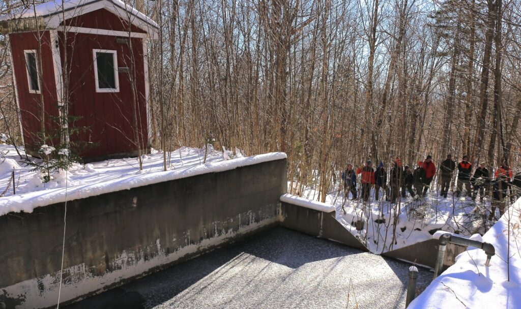 FCCI participants warmed up by hiking up to the outflow of East Bear Brook to explore the V-notch weir. The seasonal road up Lead Mountain climbs through a dense hardwood stand, and snow crunched underfoot. As the group gathered around the large concrete basin, Ivan shared BBWM’s origin story and some highlights from a third-century of fieldwork.